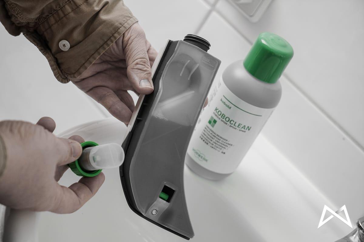 Der Behälter mit der Reinigungsflüssigkeit wird an einem grünen Hebel rausgeclipst und kann dann bequem zum Waschbecken transportiert werden. Die Kupplung (sieht aus wie eine grüne Gardena-Verbindung) wird herausgeschraubt und auf der Unterseite bis zur Markierung (3ml) mit Reiniger befüllt.