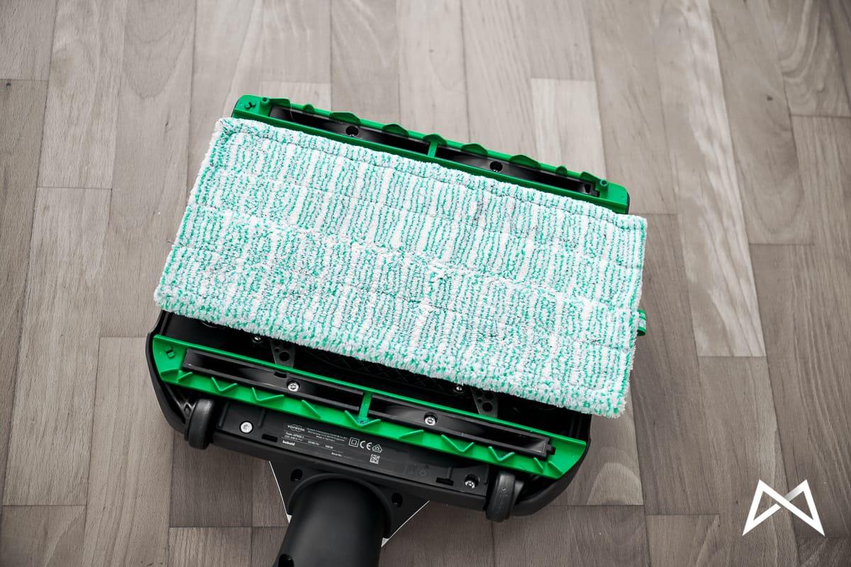 Dazwischen wird das Microfasertuch angebracht. Hierfür kann mit einem leichten zurücklehnen des Saugers und einem Tippen mit dem Fuß auf den Hebel die Trägerplatte des Wischmops ausgeworfen werden. Nun kann das neue Microfasertuch ganz einfach aufgeschoben werden und beides zusammen wieder auf den Boden gelegt werden. Mit dem SP600 wieder drüber und abgesenkt und mit einem Klick ist beides fest im SP600 verankert.