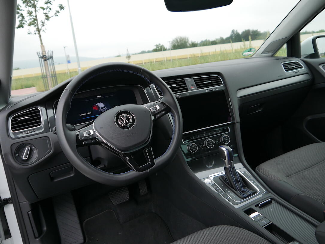 Der e-Golf sieht dabei aus wie ein normaler Golf, lediglich das Logo und die blauen Elemente heben ihn von einem gewöhnlichen Golf ab. Diese blaue Linie zieht sich durch das ganze Auto, also auch bei den Nähten im Innenraum. Es ist ein bisschen wie die blaue Version des Golf GTI, der sich durch rote Elemente abhebt.