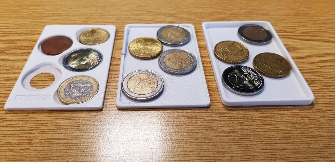 Mit dieser ausgedruckten Variante kann ganz einfach ein Münzfach „nachgerüstet“ werden. Man muss damit auf gute 2 Fächer für EC-Karten o.ä. verzichten und erhält auf der anderen Seite ein Fach, welches je nach Größe bis zu 6-8 Münzen im EC-Kartenfach verstauen kann. Die obige Variante ist die normale, etwas zu niedrige Version und nicht für EURO gedacht, funktioniert aber dennoch.