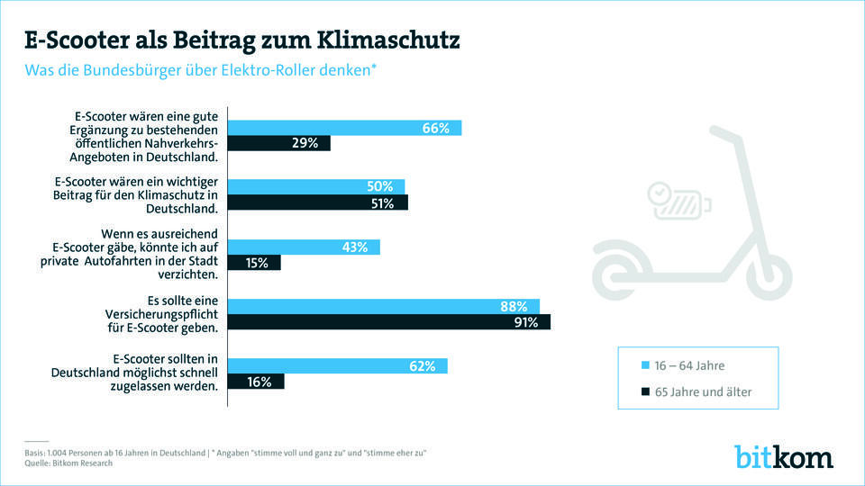 Die übergroße Mehrheit der Bundesbürger (91 Prozent) hat bereits von E-Scootern gehört. Und 43 Prozent der 16- bis 64-Jährigen würden auf private Autofahrten in der Stadt verzichten, wenn es ausreichend E-Scooter gäbe. Bei den Älteren ab 65 sind es immerhin noch 15 Prozent.