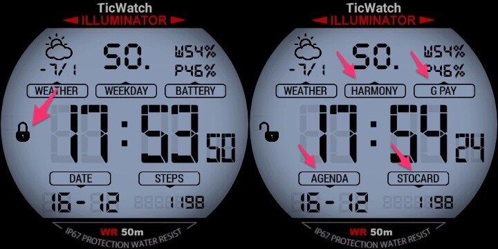 Ein Drücken auf das kleine Schloss links schaltet das Watchface um und ich kann wie rechts zu sehen ist, diverse Apps/Funktionen schnell erreichen ohne großartig durch das Menü der Uhr scrollen zu müssen usw.