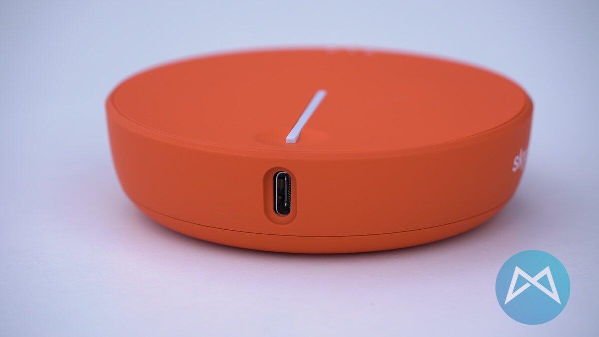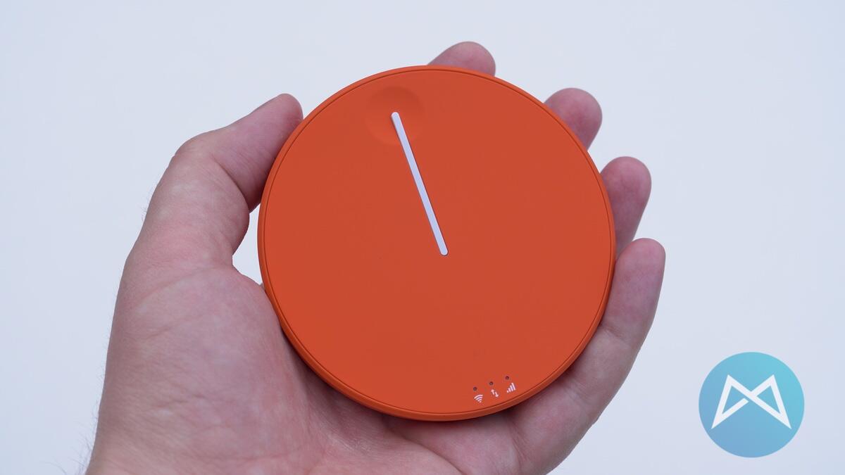 Der Skyroam Solis X Hotspot ist in einem sehr auffälligen, orangem Kunststoffgehäuse untergebracht. Auf der Front befindet sich eine LED Leiste, die zeitgleich auch als Ein- und Ausschalter fungiert. Außerdem gibt es drei Status-LEDs für WLAN, Datenverbindung und Mobilfunkempfang.