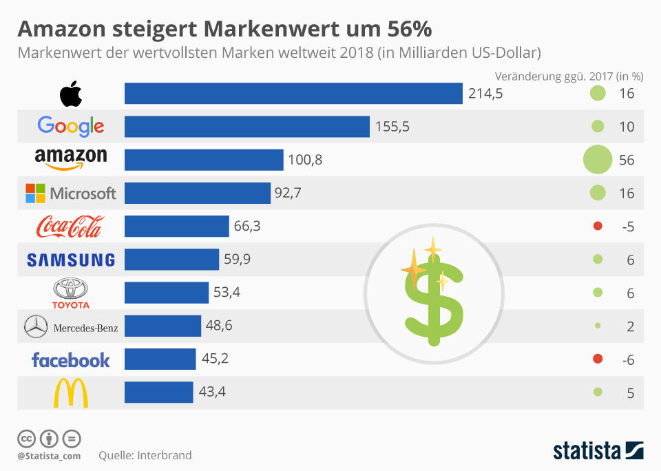 Verlierer in der Top-10-Liste, die ich euch unten von Statista eingebunden habe, sind Coca Cola (hier sieht es dank sinkendem Absatz bei zuckerhaltigen Getränken auch nicht gut aus) und Facebook (die nun einen Wandel erleben, bei denen ihnen gewisse Zielgruppen verloren gehen). Die komplette Liste mit vielen weiteren Infos gibt es bei Interbrand – dort stehen dann auch Details zum Wachstum von Netflix, dort findet ihr alle Top 100 und es gibt auch viele unterschiedliche Grafiken.