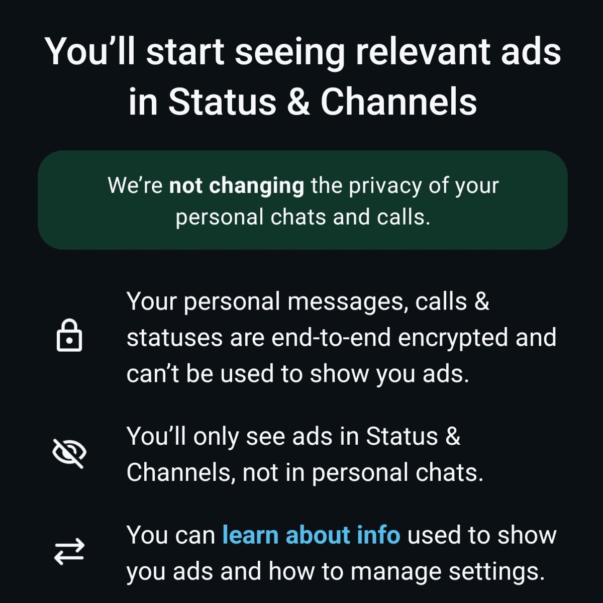 Die Werbung bei WhatsApp in Deutschland ist nicht abgesagt, im Gegenteil, aber sie wird nicht vor 2026 starten. Genießt also noch ein bisschen die Status-Beiträge eurer Kontakte bei WhatsApp, nächstes Jahr wird die Werbung zu uns kommen.