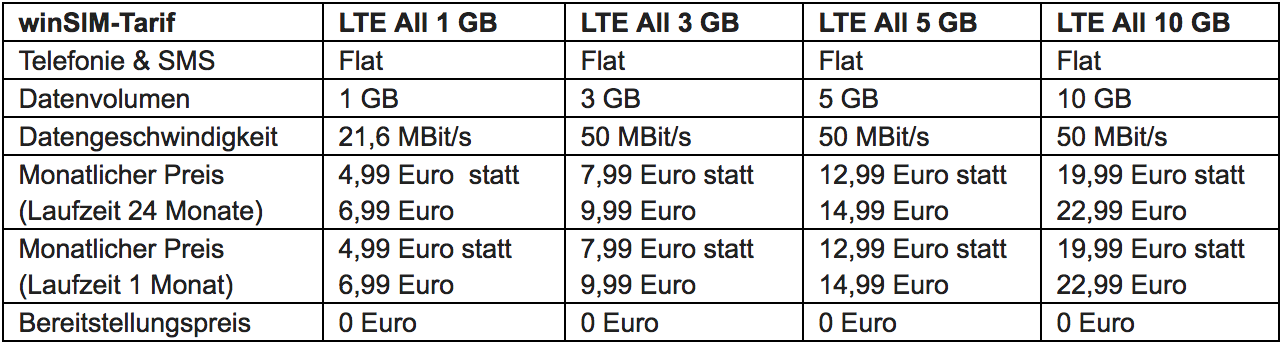 Im Rahmen einer befristeten Aktion senkt winSIM die Preise bei allen LTE All Tarifen. Das gilt auch für die monatlich kündbaren Tarife, zudem wird auch der Bereitstellungspreis gestrichen.