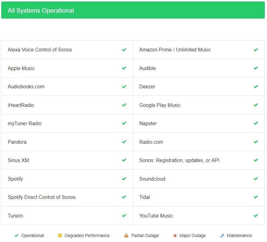 Ein Tipp von Sonos via Twitter war also der, dass man direkt nach der Störung im Browser die Seite status.sonos.com aufrufen soll. Hier wird dann innerhalb von Sekundenbruchteilen angezeigt, ob gerade alle Dienste mit Sonos agieren können.