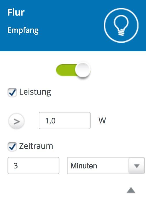 Dort fügen wir nun die jeweilige Funksteckdose ein, und setzen in deren Einstellungen die Überwachung der Leistung auf aktiv. Anschließend sollte ein Wert eingestellt werden, der idealerweise überschritten wird, sobald die Leuchte an der Steckdose aktiv ist. In meinem Fall 1 Watt (die Leuchte braucht ca. 5 Watt). Darunter kann noch die Zeitspanne eingestellt werden, wie lange die Leuchte aktiviert sein soll.