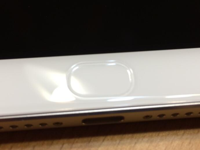 Die Front wird bedeckt durch ein durchgängiges Displayglas. Anstelle des Homebuttons befindet sich eine ovale Vertiefung, unter der sich der Ultraschall-Fingerprint-Sensor befindet.
