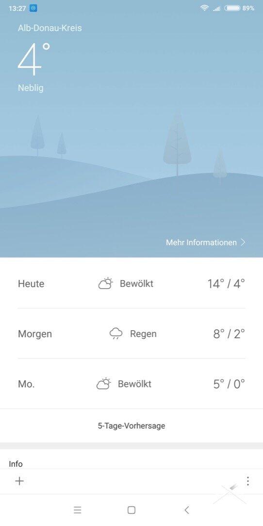 Vorinstalliert ist in meinem Fall Android 7.1.1 mit der hauseigenen Oberfläche MIUI 8.5. Diese ist definitiv verspielt und im Grunde eine Mischung aus iOS und Android. Mir gefällt sie sehr. Es gibt einige Änderungen im Gegensatz zu Stock-Android. Die meisten Erweiterungen gehen mehr ins verspielte, aber dennoch informative. So finden wir z. B. in der Benachrichtigungsleiste beim herunterklappen auch eine Wetter-Info, oder wir können uns in der Ben.leiste den aktuellen Download-Speed anzeigen lassen usw.