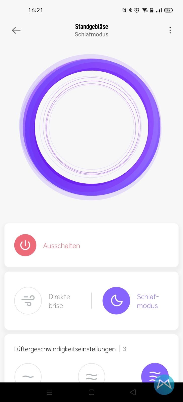 Einmal installiert wird der Ventilator dann in der App gelistet und kann dort mit einem Klick ein- oder ausgeschaltet werden.