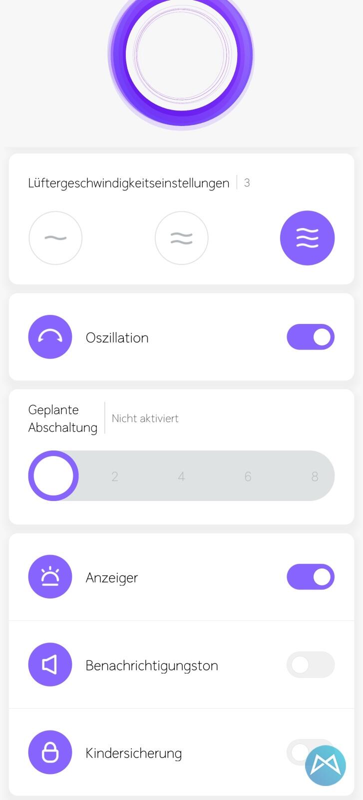 Ein Klick auf den Button (und nicht direkt auf das Power-Symbol) bringt euch zu den allgemein möglichen Einstellungen. Hier kann der Venti dann auf oszillieren gestellt, die Kindersicherung aktiviert, der Benachrichtigungston ein- oder ausgeschaltet oder aber ein Timer aktiviert werden.