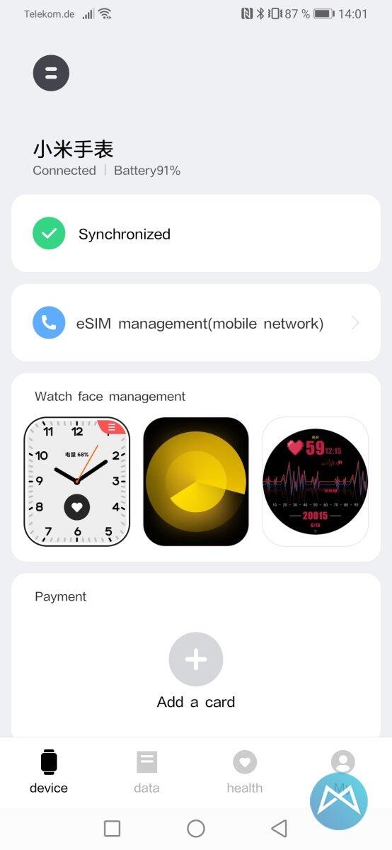 Von Werk aus sind einige Watchfaces auf der Xiaomi Mi Watch vorinstalliert. Diese lassen sich wie gewohnt durch langes drücken auf eines der Watchfaces oder via Wear OS-App abändern. Leider sind diese auch schon auf der Uhr vorinstalliert und selbst mit dem Trick der englischen Systemsprache teils mit chinesischen Zeichen versehen. Beispielsweise neben der Akkuanzeige auf dem Header-Foto dieses Artikels. Auch jedes nachgeladene Watchface aus dem chinesischen Appstore ist teilweise chinesisch (logischerweise).