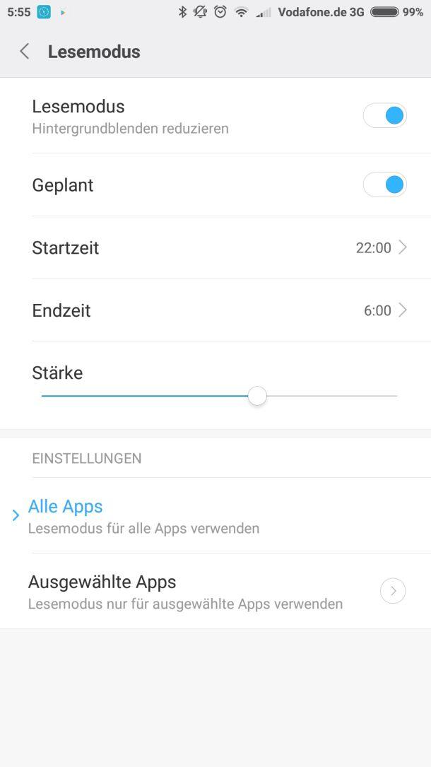 Wie es sich für ein aktuelles Smartphone gehört, lässt sich auch dieses Display in Sachen Farbe von kalt -> warm einstellen und auch ein Lesemodus wurde eingebaut. Selbiger lässt sich entweder manuell oder nach einem festgelegten Zeitmodell aktivieren.