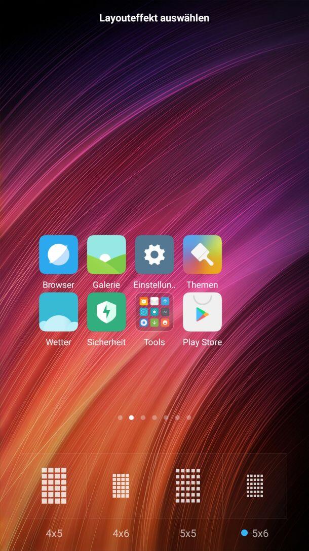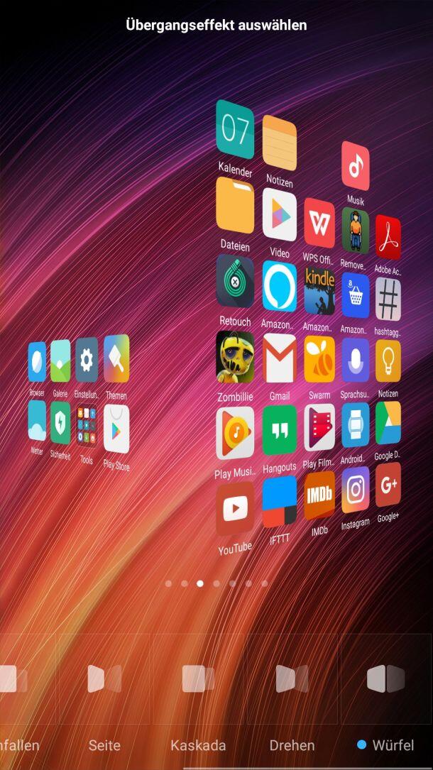 Der Launcher ist umfangreich anpassbar. Möchte man etwas mehr Apps auf dem Homescreen gelistet haben, lässt sich beispielsweise das Icon-Gitter justieren. Auch die Transition-Effekte können angepasst werden. Und wenn das noch nicht ausreicht, gibt es auch noch zahlreiche Themes, welche den Look noch einmal komplett abändern.