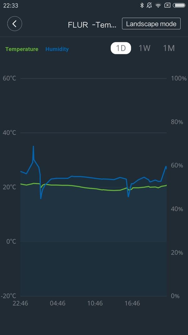 Weiterhin lässt sich von dem Temperatur- und Luftfeuchtigkeitsverlauf scheinbar kein Backup machen, nicht auf dem Gerät und auch nicht in der Cloud, selbst in der MiCloud nicht. Mysteriöserweise gab es dann auch in unregelmäßigen Abständen unerklärliche Abfälle bei der Luftfeuchtigkeit. Die einstellbaren Pushbenachrichtigungen bei Ereignissen, wie zum Beispiel „zu hohe Luftfeuchtigkeit“, funktionierten allerdings tadellos, sie schienen in Echtzeit zu kommen.