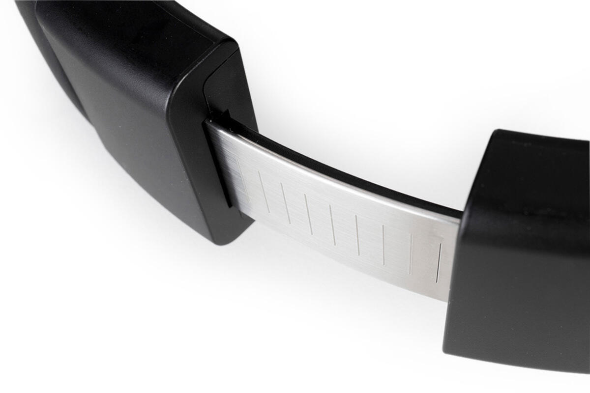 Der verstellbare Kopfbügelschieber besteht an der Innenseite aus Kunststoff und wurde außen mit Metall verstärkt. Das Konstrukt ist sehr stabil, der Bügel hält auch stärkerer Dehnung und Verwindung stand, ohne nervige Geräusche von sich zu geben oder gar zu brechen. Auch beim Tragen und Bewegen konnte ich keinerlei Knarzen vernehmen.