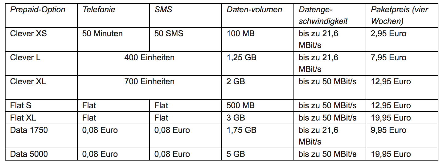 Darüber hinaus gibt es die neue Clever XL-Option mit 700 Einheiten für Telefonie und SMS sowie 2 GB Datenvolumen mit bis zu 50 MBit/s für 12,95 Euro. Ebenfalls neu ist die Option Clever XS. Sie bietet für 2,95 Euro je 50 Einheiten für Telefonie und SMS sowie 100 MB Datenvolumen.