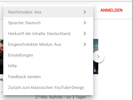 Nun schließt ihr die Entwicklerkonsole und ladet die YouTube-Website einmal neu. Wenn alles geklappt hat, solltet ihr oben rechts ein kleines Menü (drei Punkte) finden, über das ihr den Nachtmodus aktivieren könnt. Ich musste mich vorher einmal aus- und wieder einloggen, ob das immer notwendig ist, kann ich nicht mit Sicherheit sagen.