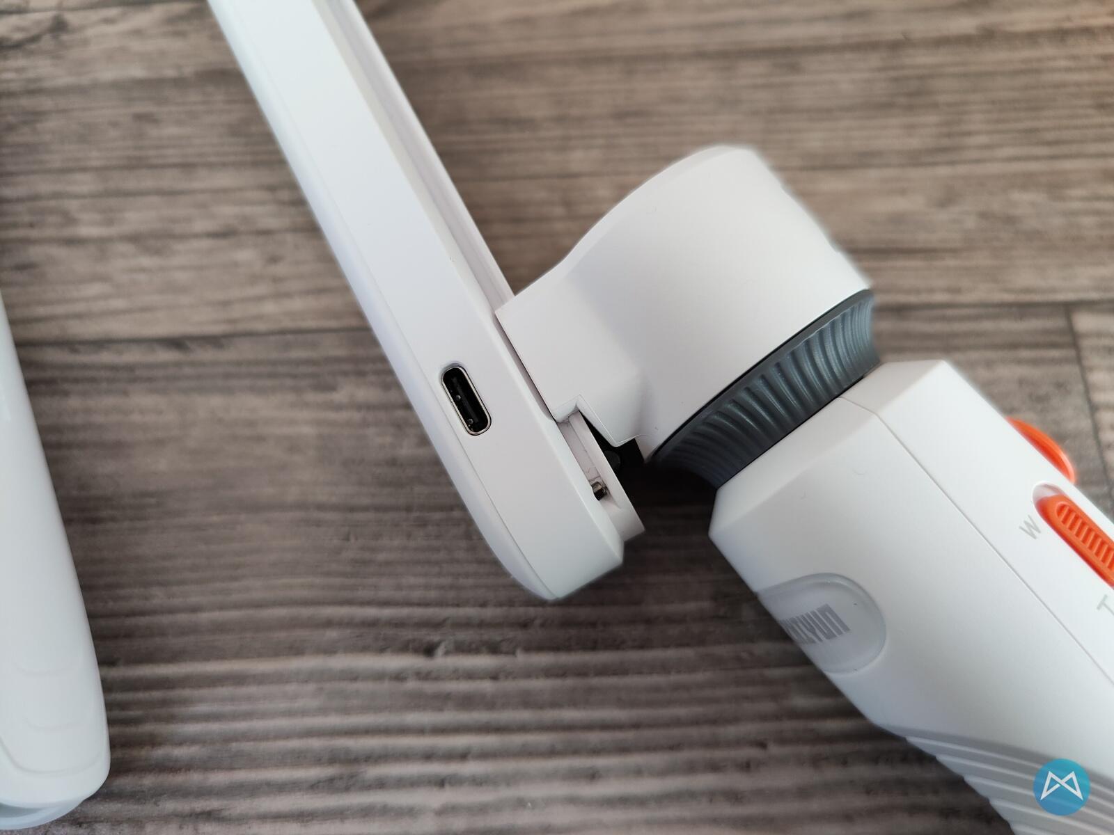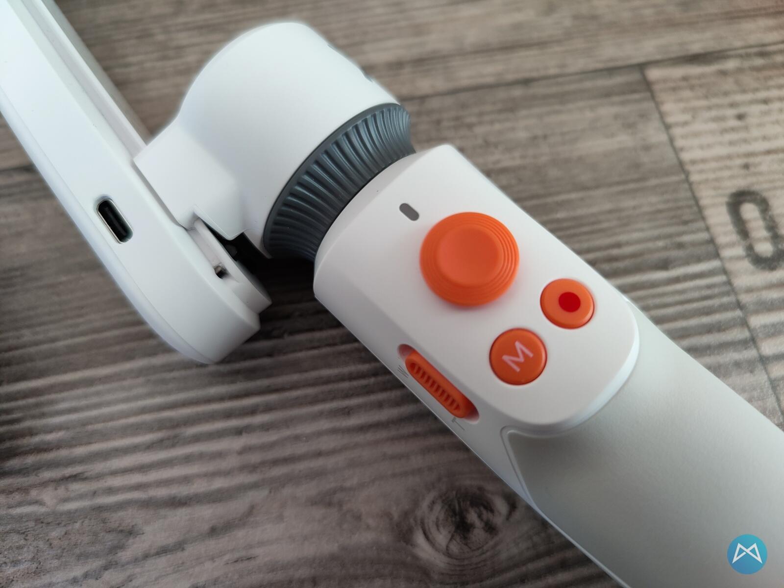 An Tasten finden wir links vom leicht abgeschrägten Griff eine Wippe, die das Zoomen via Taste ermöglicht. Dazu gibt es mittig einen Joystick, um das Smartphone am Gimbal zu bewegen. Dazu können mit den beiden Tasten darunter noch die verschiedenen Modi durchgeschaltet werden und die Aufnahme eines Fotos oder Videos gestartet werden.