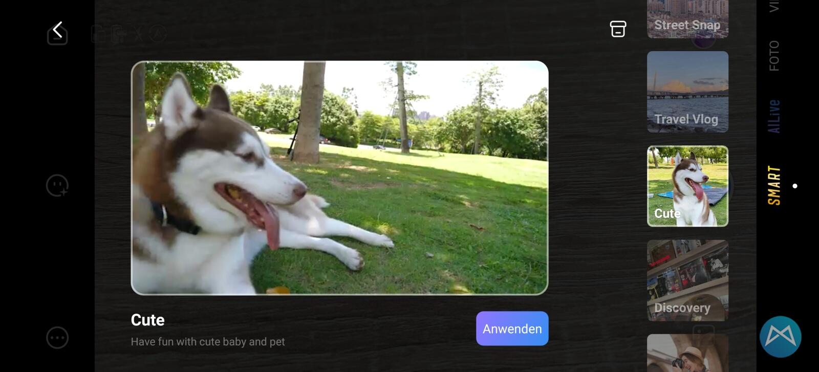 Dazu finden wir auch noch den Reiter „SMART“. Hier gibt es dann die Anleitungen, wie aus den aufgenommenen Clips schicke Zusammenschnitte werden. Je nach Motiv dann passend für den Travel Vlog, das süße Tierchen und so weiter.