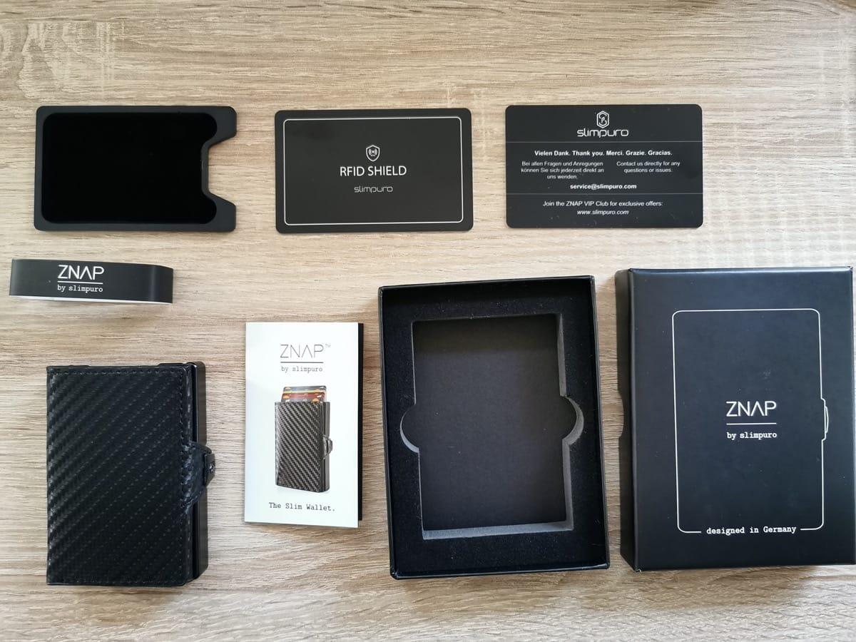 Im Lieferumfang des ZNAP Wallet befindet sich hübsch verpackt das Wallet selbst, ein bisschen Papierwerk, eine Plastikkarte zur Produktbewertung, eine Karte als RFID-Schutz und ein Münzfach.