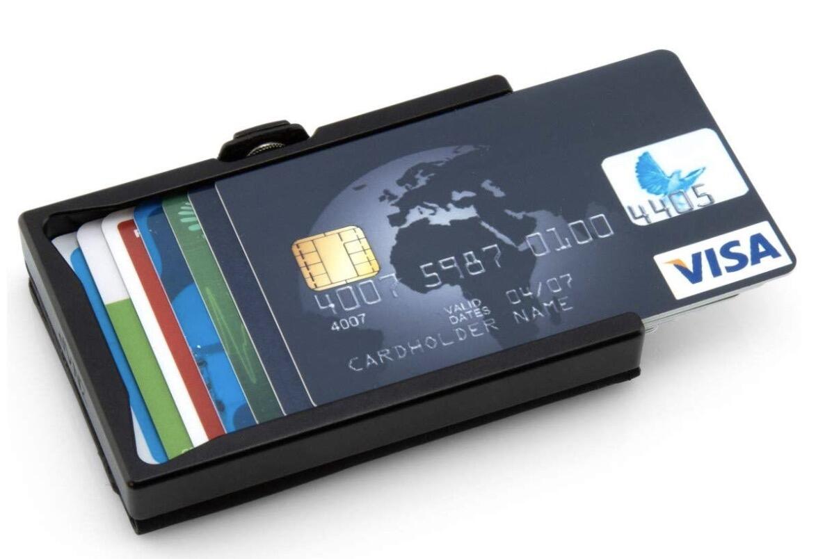 Im Kartenfach aus gefrästem Flugzeug-Aluminium auf der Rückseite können bis zu 12 Plastikkarten untergebracht werden. Dann allerdings ohne das Münzfach, ohne die Karte für den RFID-Schutz und bestenfalls nur Karten ohne Prägung (Kreditkarten). Selbst mit Münzfach und RFID-Schutzkarte bleibt allerdings noch genug Platz für 6-8 Karten. Das Fach selbst schützt schon aus drei Richtungen vor RFID-Datendiebstahl. Für die fehlende vierte Seite liegt die RFID-Schutzkarte im Lieferumfang.