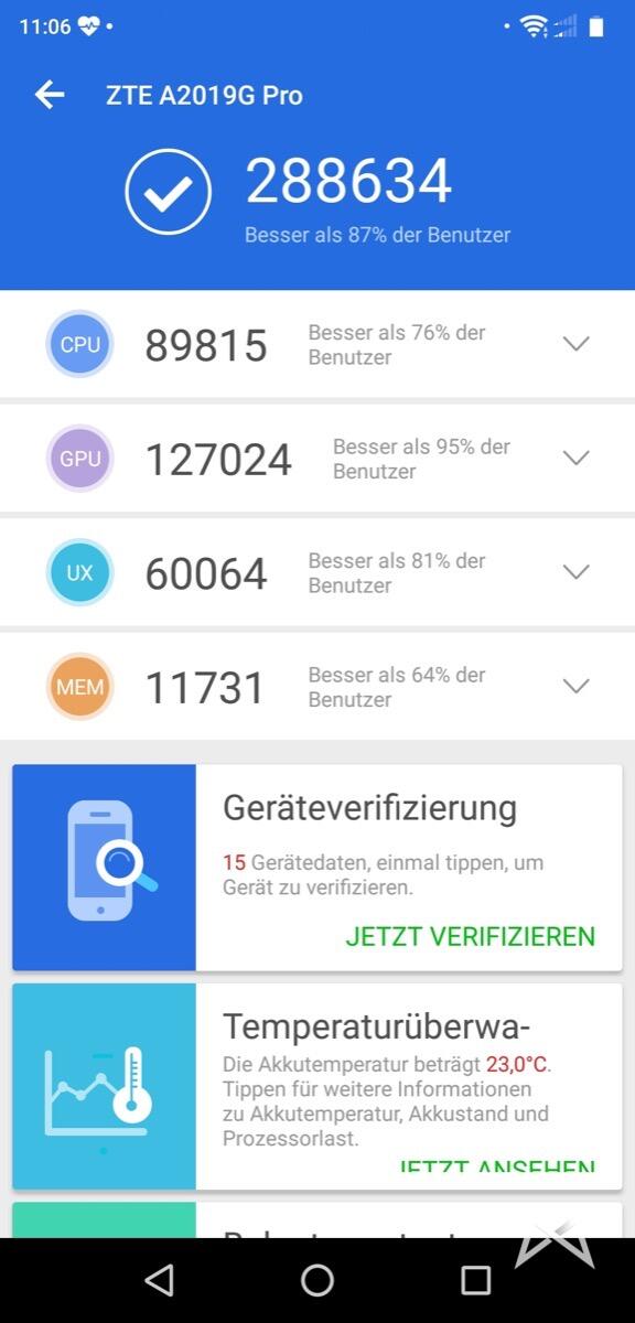 Im Inneren arbeitet ein Snapdragon 845 Prozessor mit den 6 GB RAM und dem knapp 4000 mAh starken Akku super zusammen. Im AnTuTu erreicht das ZTE Axon 9 Pro mal eben satte 288.634 Punkte! Damit ist es ganz sicher sehr weit oben in der Liste aktueller Smartphones und zeigt auch im Alltag praktisch keine Ruckler oder dergleichen.