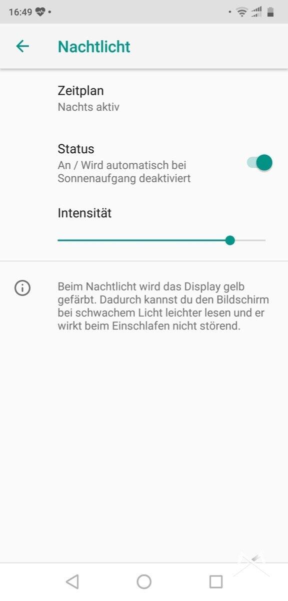 Selbstverständlich gibt es auch den mittlerweile bekannten Modus zum schon der Augen bei Dunkelheit. Im Falle des ZTE liebevoll als „Nachtlicht“ benannt. Einfach einstellen, dass dieser Modus bei Dunkelheit aktiviert werden soll und fertig.
